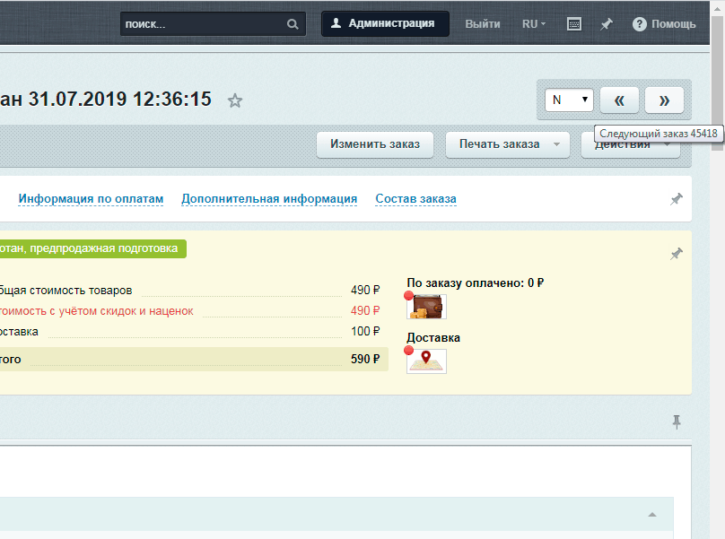 Модуль отображает кнопки перехода к следующему и предыдущему заказу.