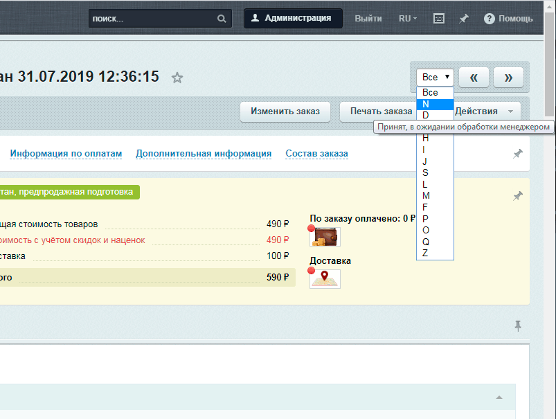 Кнопки выводятся на странице просмотра заказа в административной части.