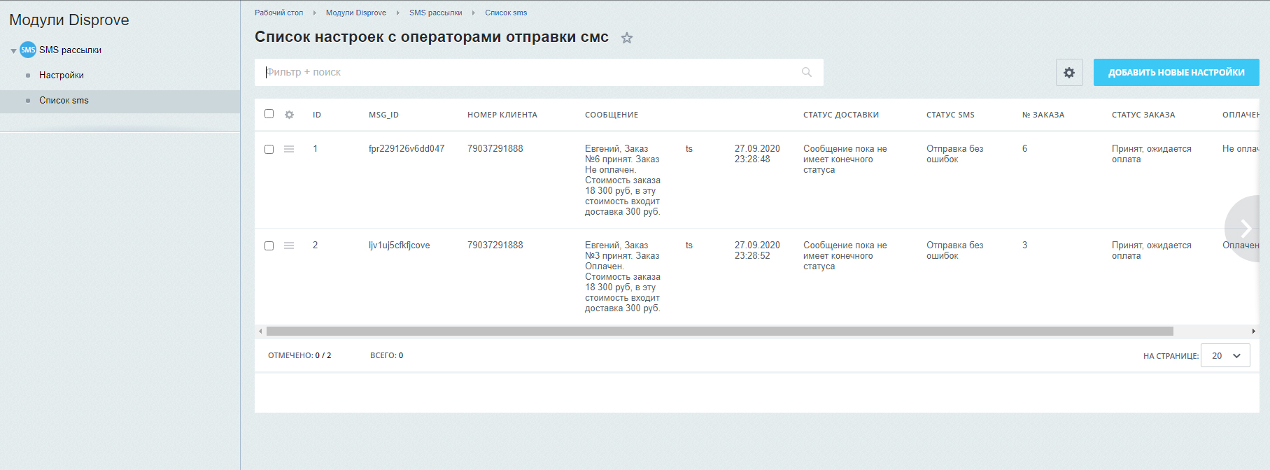 После формирования сообщений и смене статусов по триггеру или вручную совершается отправка смс. Наш агент проверяет доставлено ли сообщение до адресата или были проблемы.