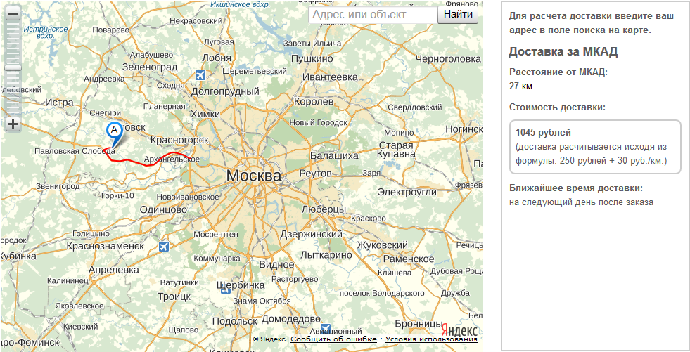 Модуль вычисляет расстояние от МКАД на основе введенного адреса. Используется для расчета стоимости доставки для пользователей интернет-магазина. Не является автоматизированной службой доставки. Рекомендуется размещать на информационной странице "Доставка" (в настройках модуля задается стоимость километра пути на основе которого вычисляется стоимость доставки).