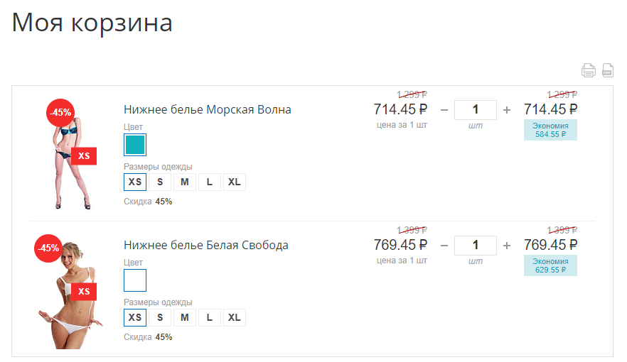 Модуль предоставляет возможность создавать PDF спецификацию корзины в табличном виде или отправлять на печать.