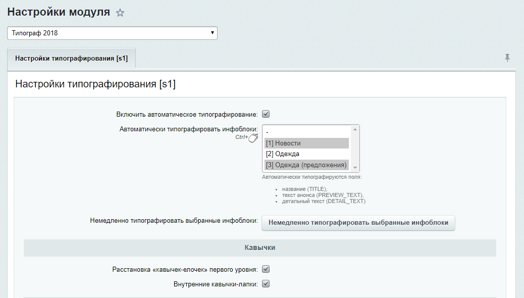 - Включить автоматическое типографирование — включает возможность автоматического типографирования инфоблоков, выбранных в поле ниже.