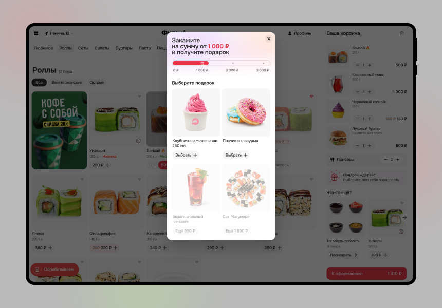7. Дополнительные товары — при добавлении в корзину роллов, автоматически добавятся соусы и палочки, а для борща - сметана.