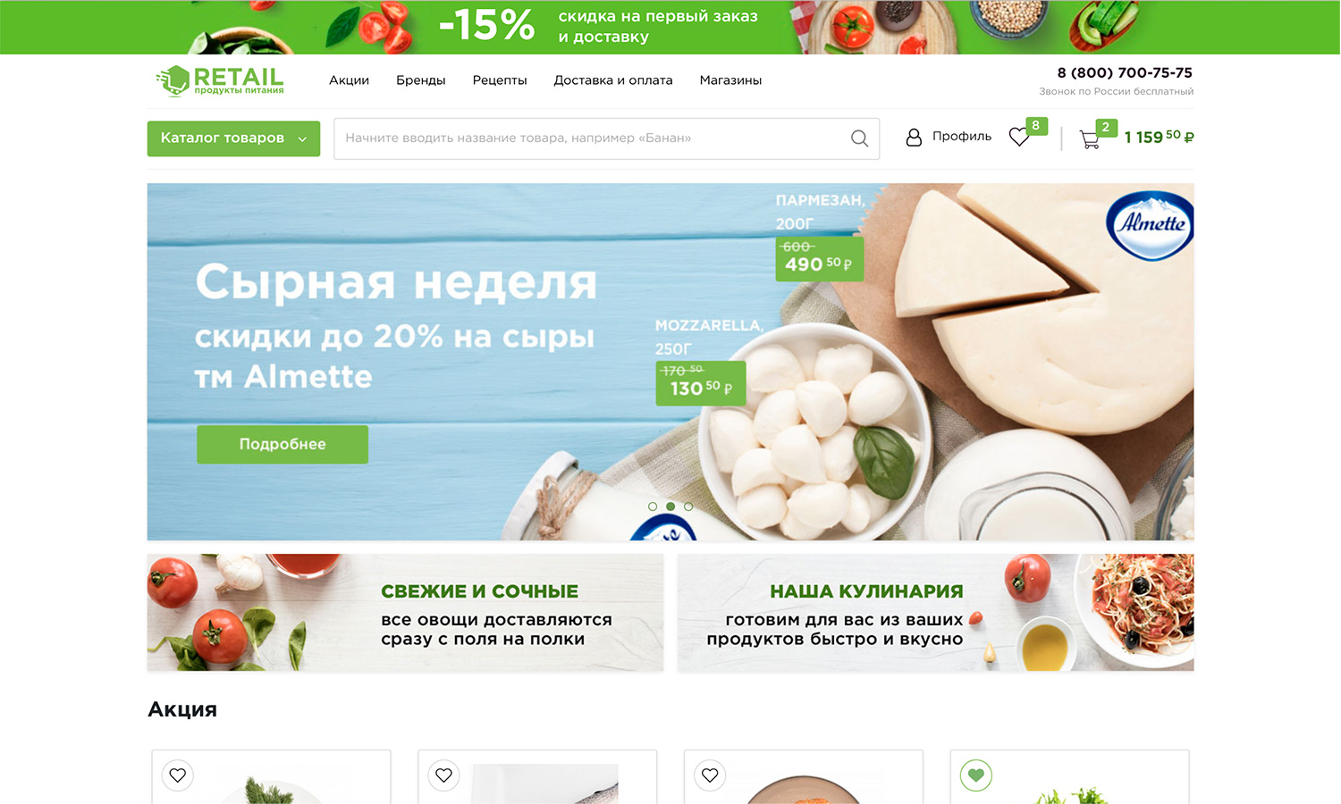 Она наполнена функционалом и маркетингом необходимым для успешного retail-магазина.