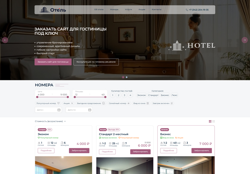 Сайт для гостинцы, отеля, хостела с современным и адаптивным дизайном.