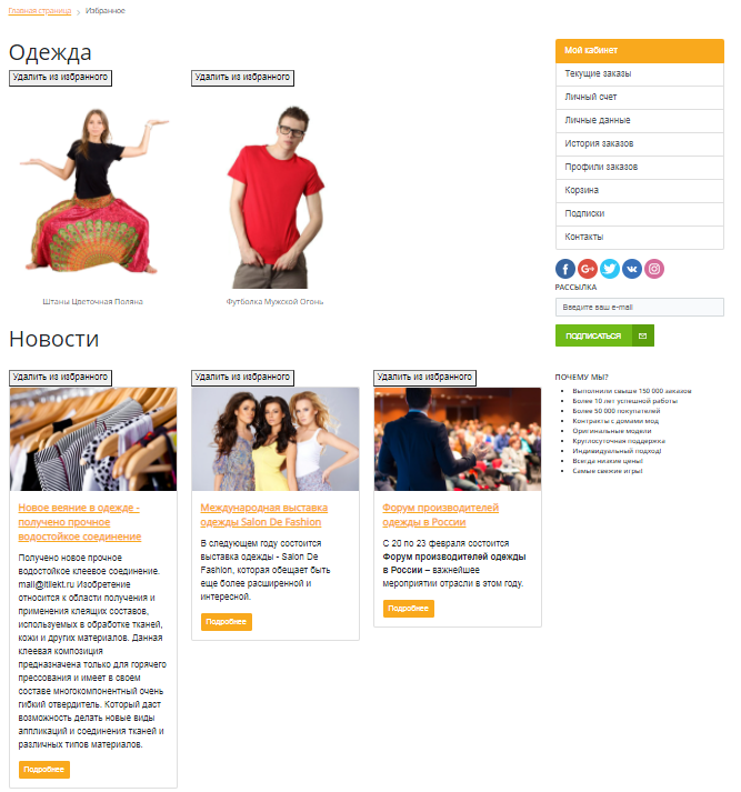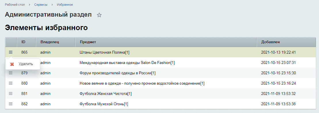 Модуль позволяет пользователям вашего сайта добавлять в список избранного товары, новости, услуги и т.д. Пользователи могут просматривать свой список избранного и удалять из него элементы.