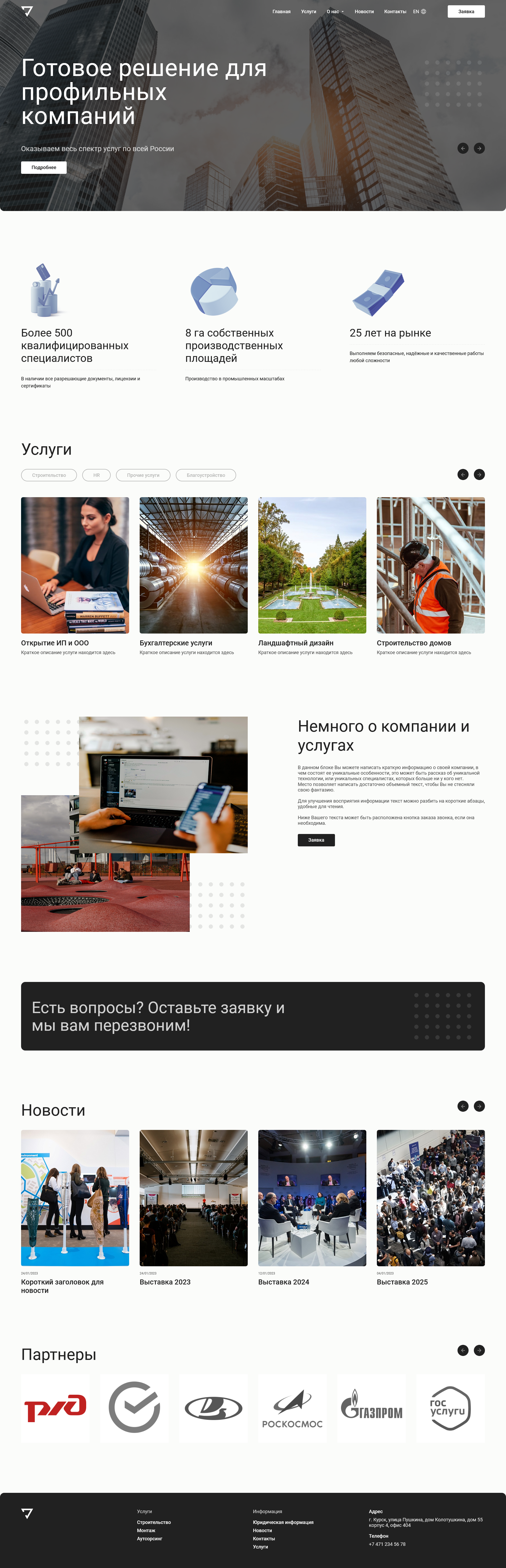Практичный корпоративный сайт с адаптивной вёрсткой, подходящий под любую нишу: строительство, производство, салоны красоты, дизайн-студии и так далее.