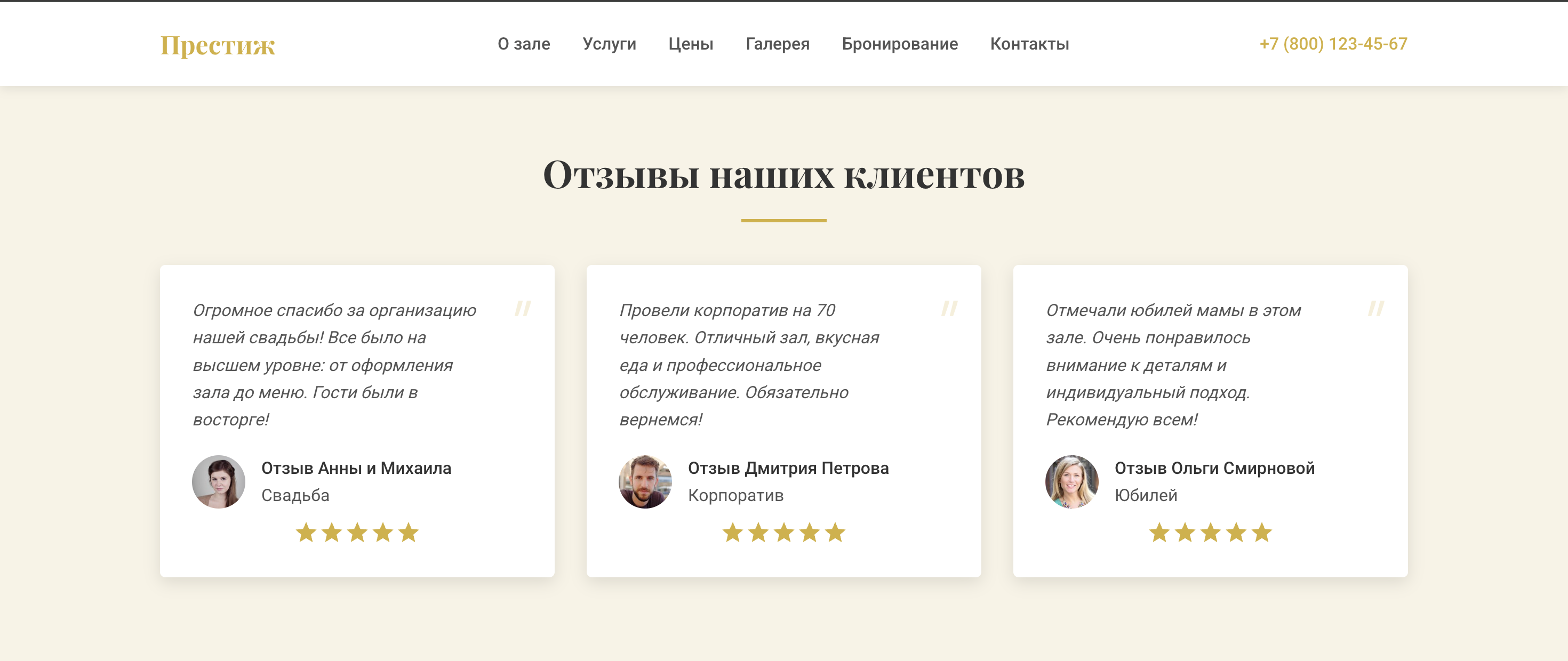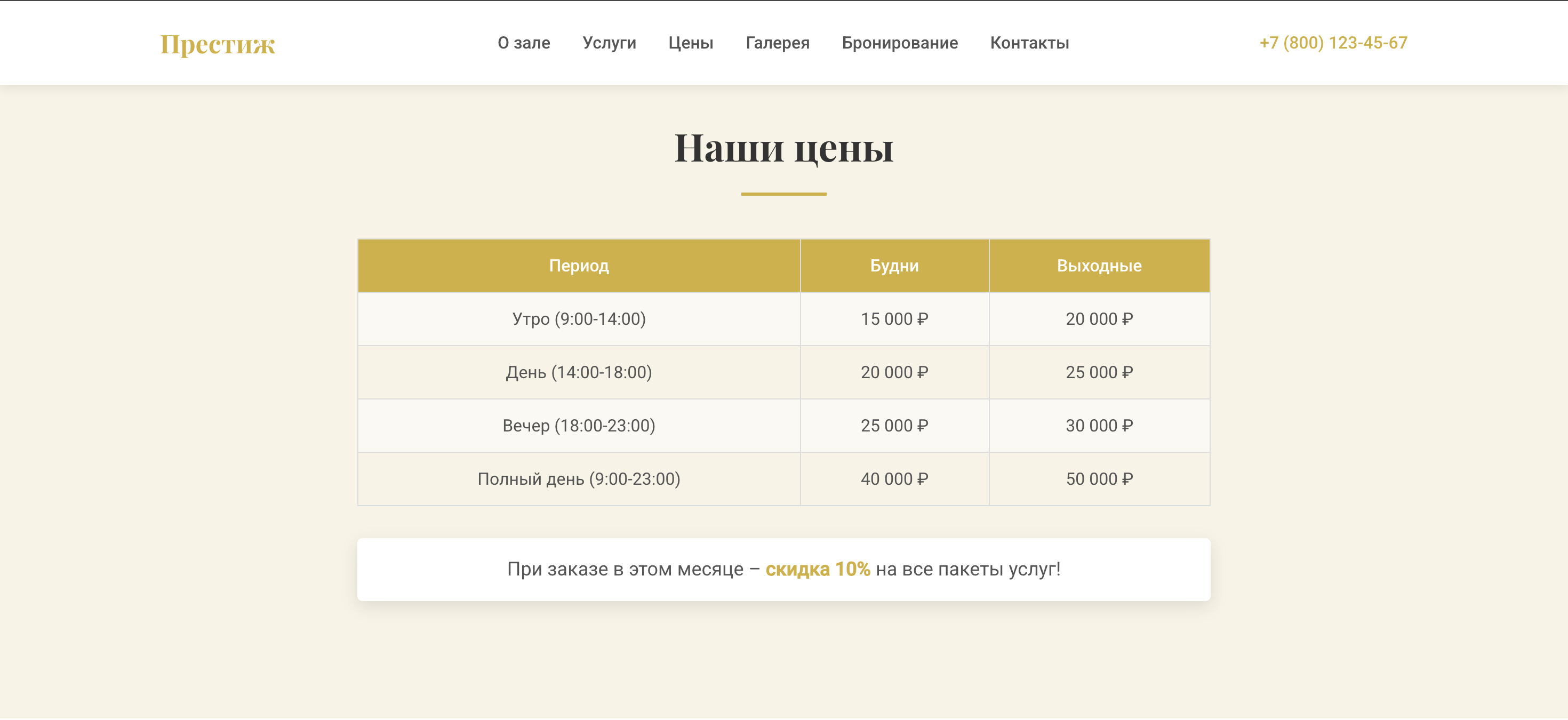 Prestige — веб-шаблон для 1С-Битрикс, реализованный как лендинг. Решение построено на компонентной системе Битрикс с использованием инфоблоков для управления контентом.<br /><br /><b><span class="bx-font" style="font-size:14pt; line-height: normal;">Структура страницы</span></b><br /><br />Страница состоит из последовательности секций, каждая из которых подключается как отдельный компонент:<br /><ul><li>Hero-секция — главный экран с фоновым изображением<br /><li>О компании — информационный блок с описанием<br /><li>Услуги — каталог предоставляемых услуг<br /><li>Ценообразование — таблица тарифов<br /><li>Галерея — портфолио работ и мероприятий<br /><li>Отзывы — социальные доказательства<br /><li>Процесс бронирования — пошаговая инструкция<br /><li> Форма бронирования — интерактивная форма записи<br /><li>Контакты — контактная информация с картой<br /></ul><br /><b>Шапка сайта</b><ul><li>Логотип с настраиваемым текстом и ссылкой<br /></ul><ul><li>Навигационное меню<br /></ul><ul><li>Контактная информация<br /></ul><b>Подвал сайта</b><ul><li>Дополнительное меню<br /></ul><ul><li>Информация об авторских правах<br /></ul>
