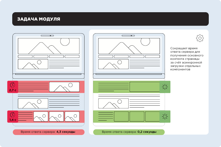 Модуль позволяет производить отложенную загрузку компонентов, тем самым ускоряя загрузку страницы. Демонстрация работы в видео в конце страницы!