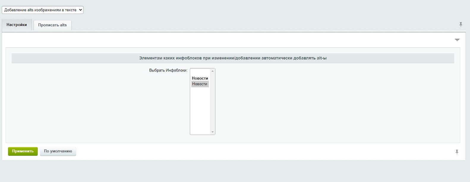 2. Позволяет осуществлять автоматическую установку alt-текстов для нескольких выбранных инфоблоков.