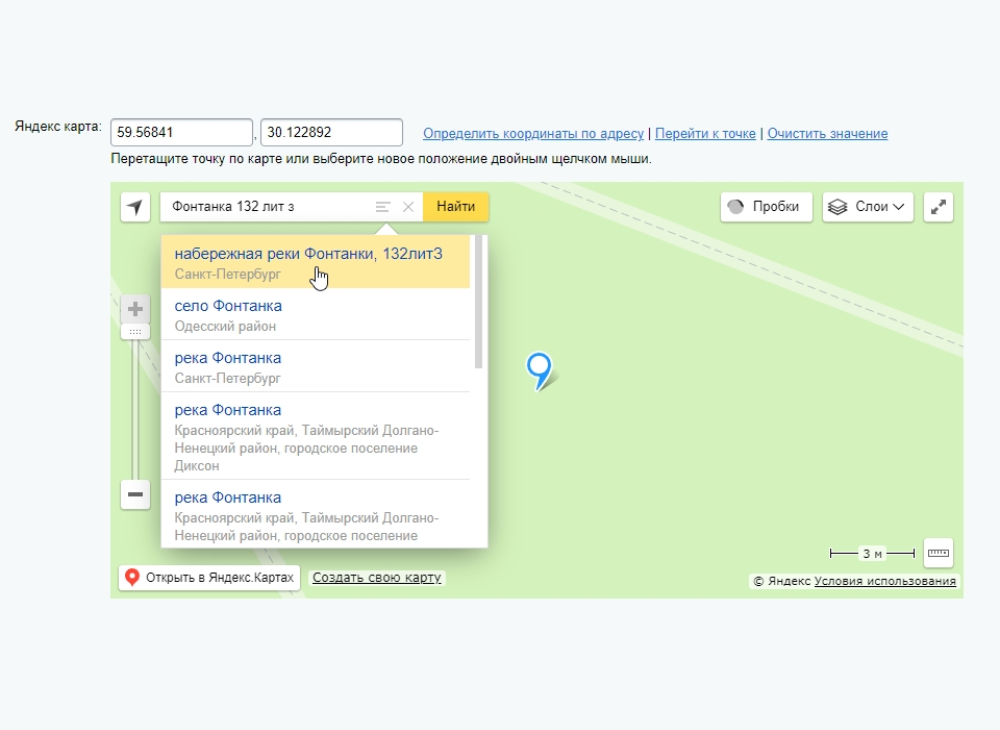 Можно заполнить точные координаты или начать вводить адрес в соответствующую строку и выбрать из предложенных вариантов нужный.