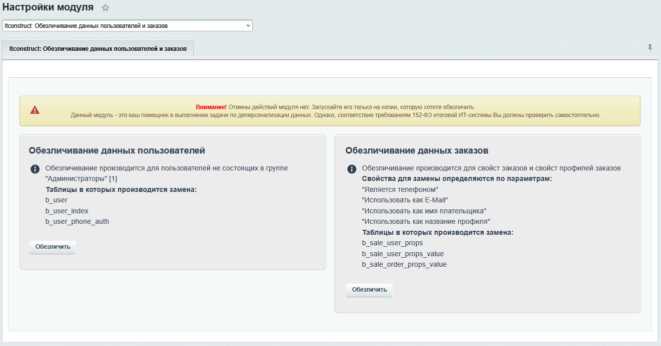 Модуль обезличивает данные пользователей сайта (для любых редакций 1С-Битрикс: Управление сайтом) и заказов в интернет-магазине (для редакций "Бизнес" и "Малый бизнес")