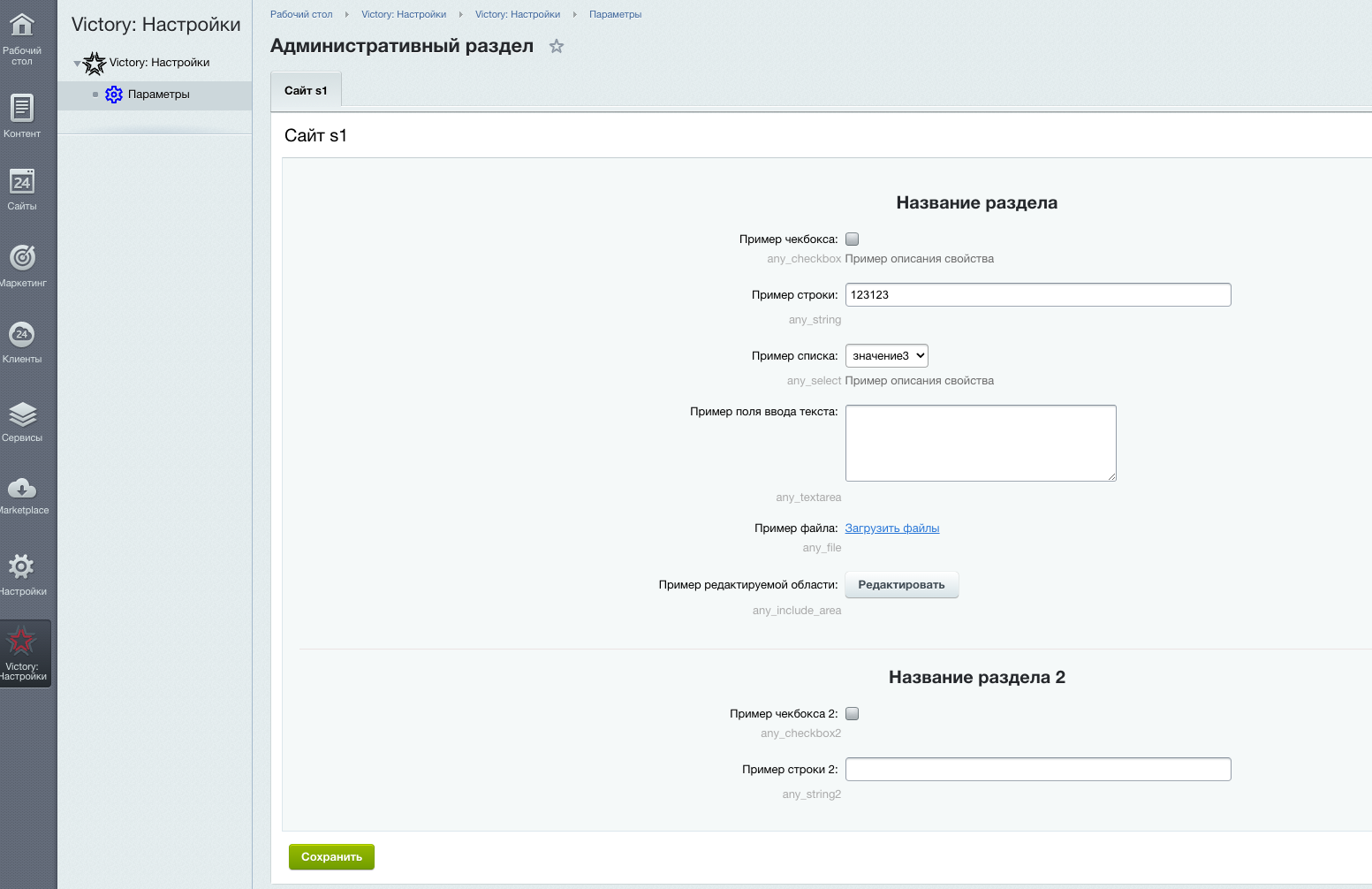 $config = [ [ 'section' => [ 'name' => 'Название раздела', 'fields' => [ 'any_checkbox' => [ 'label' => 'Пример чекбокса', 'type' => 'checkbox', 'value' => 'Y', ], 'any_string' => [ 'label' => 'Пример строки', 'type' => 'text', 'value' => '', 'size' => 60 ], 'any_select' => [ 'label' => 'Пример списка', 'type' => 'select', 'value' => [ 'value1' => 'значение1', 'value2' => 'значение2', 'value3' => 'значение3', 'value4' => 'значение5', ], ], ] ] ], [ 'section' => [ 'name' => 'Название раздела 2', 'fields' => [ 'any_checkbox2' => [ 'label' => 'Пример чекбокса 2', 'type' => 'checkbox', 'value' => 'Y', ] ] ] ] ]; |