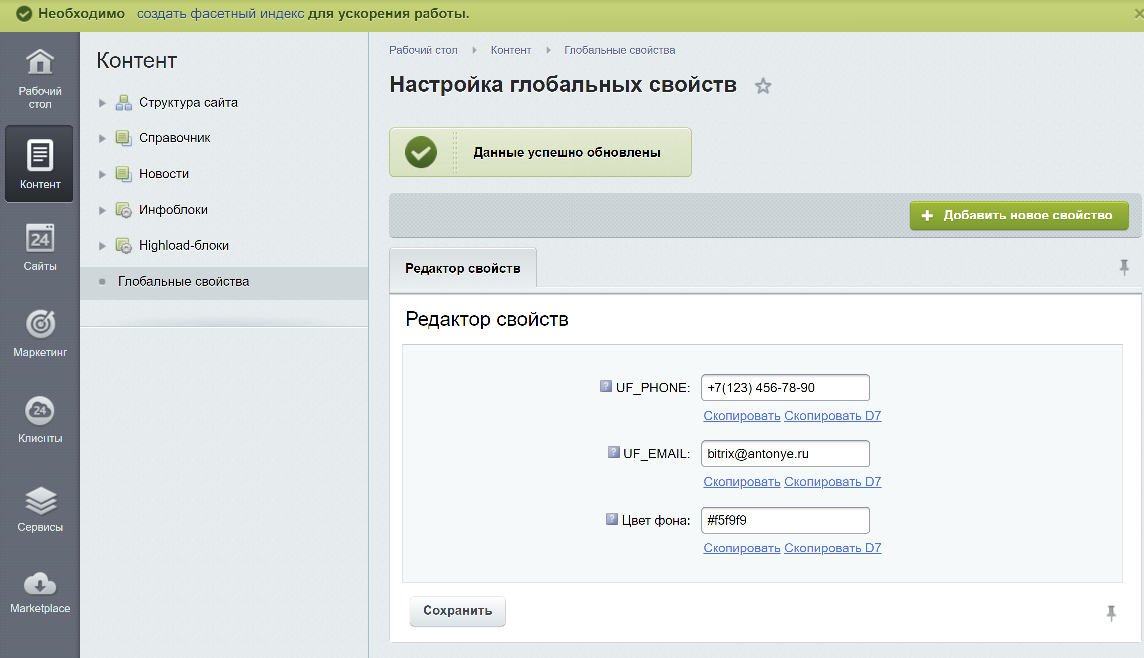 - Добавить значение нового свойства на данной странице и нажать "Сохранить"