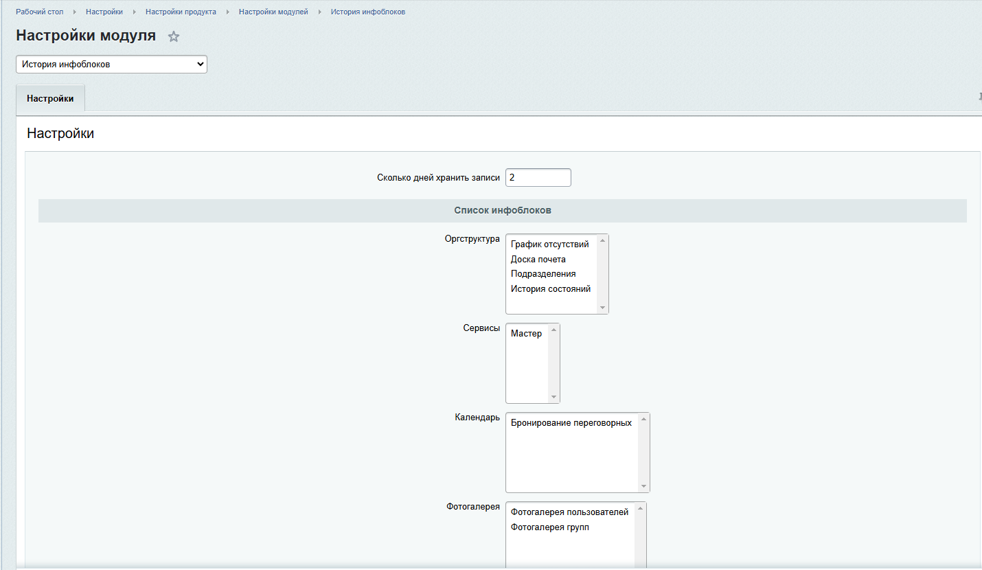 В настройках модуля можно указать, какие элементы будут отслеживаться, а также настроить время хранения записей изменения истории.