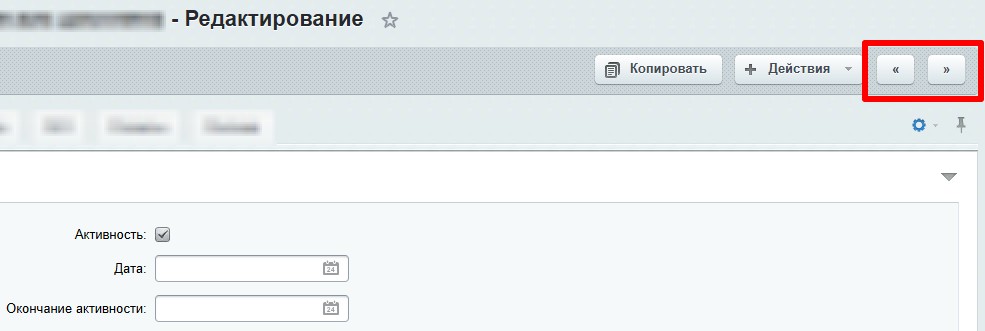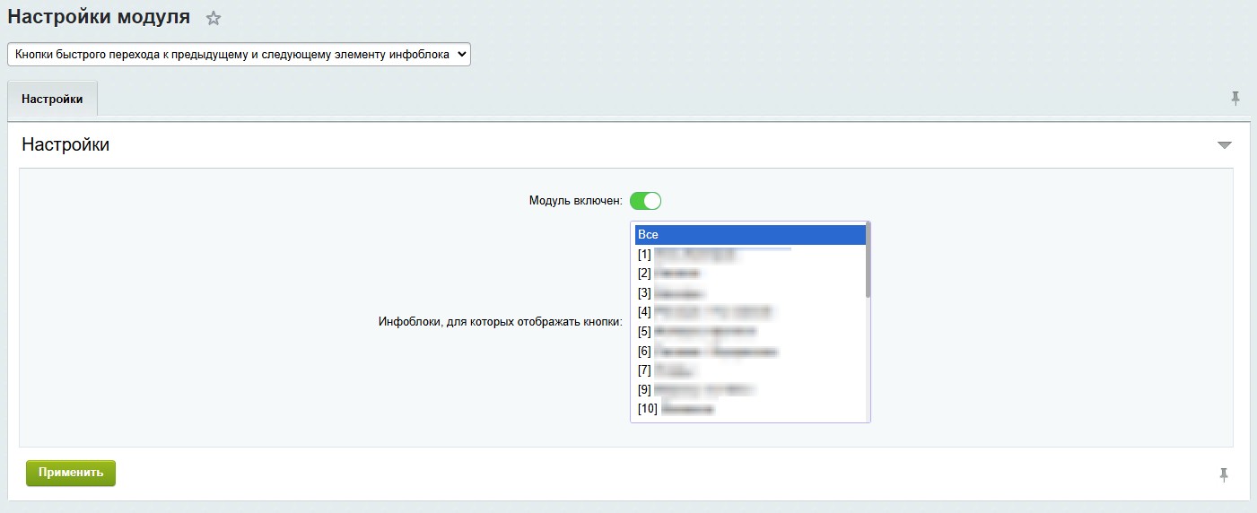 Модуль в административной части на странице редактирования элемента инфоблока добавляет удобные кнопки для быстрого перехода к предыдущему и следующему элементу.