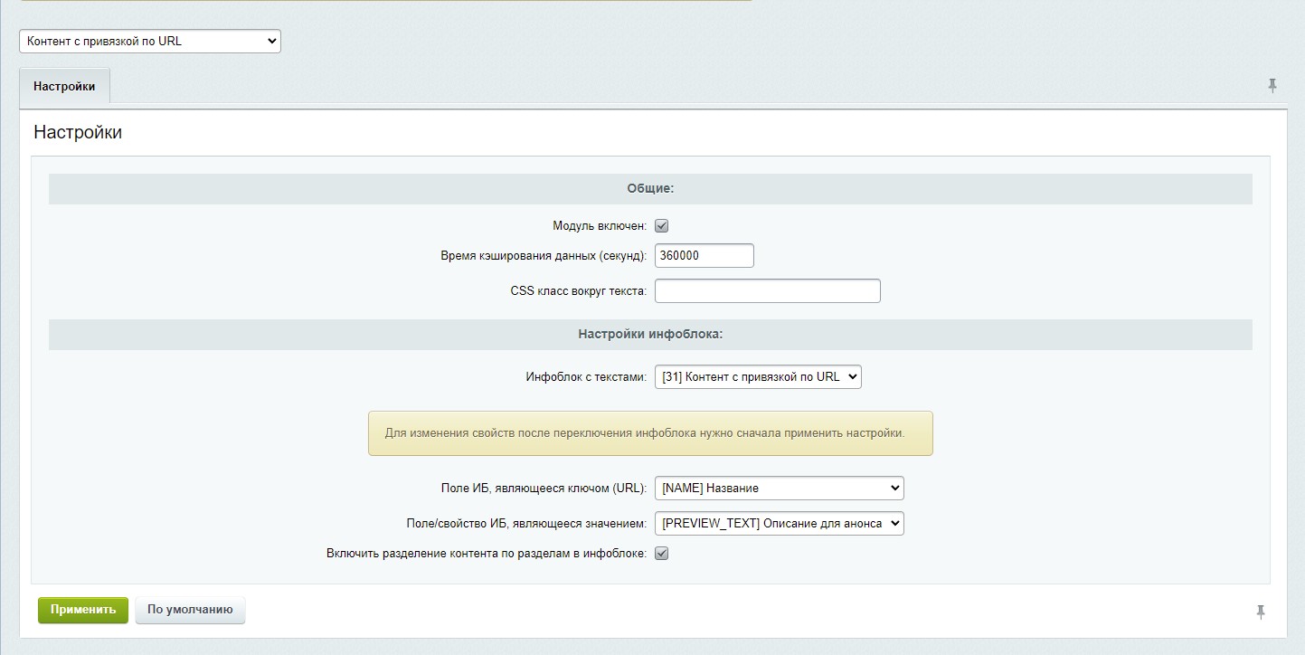 - Инфоблок с текстами – позволяет собственно выбрать инфоблок, из которого будут доставаться данные (по умолчанию используется инфоблок, созданный при установке модуля);