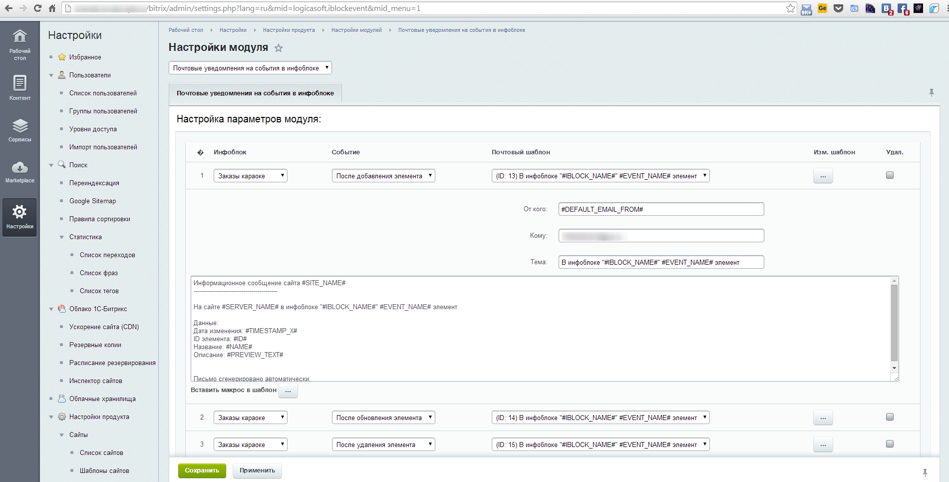 Для работы с модулем не требуется специальной настройки. Установите модуль, после чего в настройках модуля вы можете выбрать инфоблок, тригер и создать почтовый шаблон на это событие