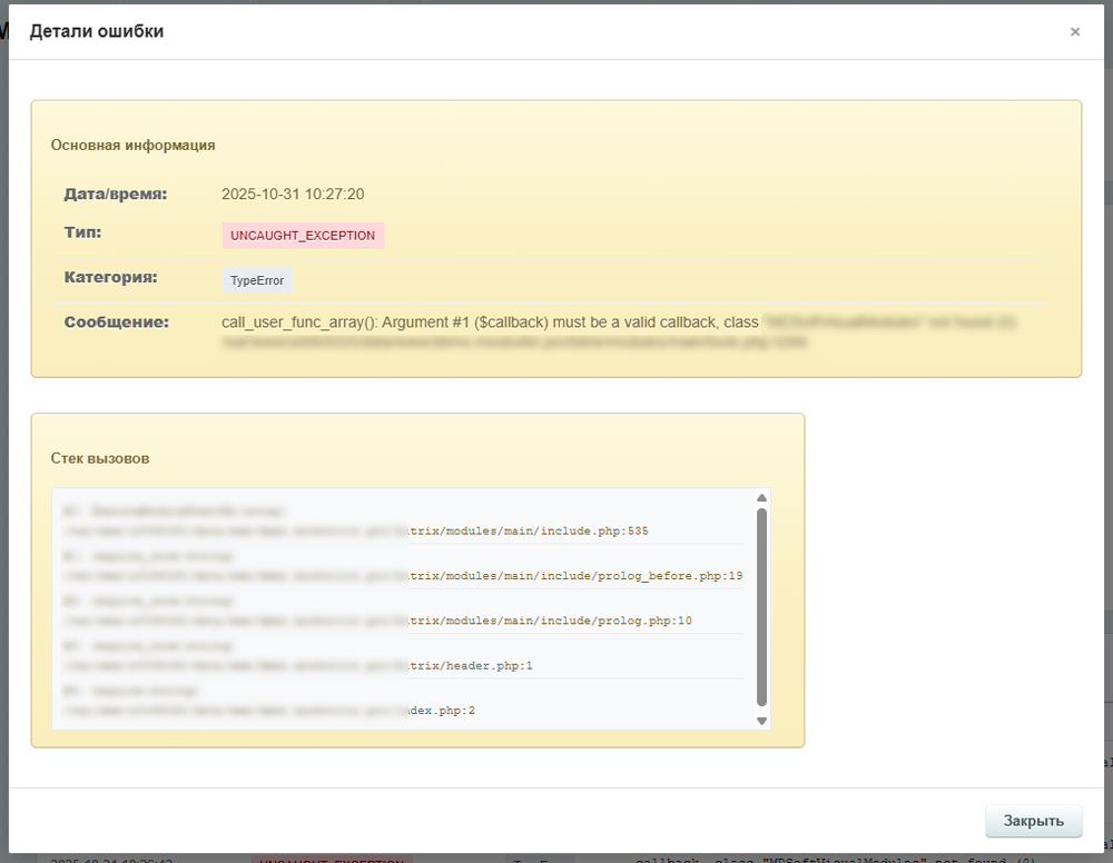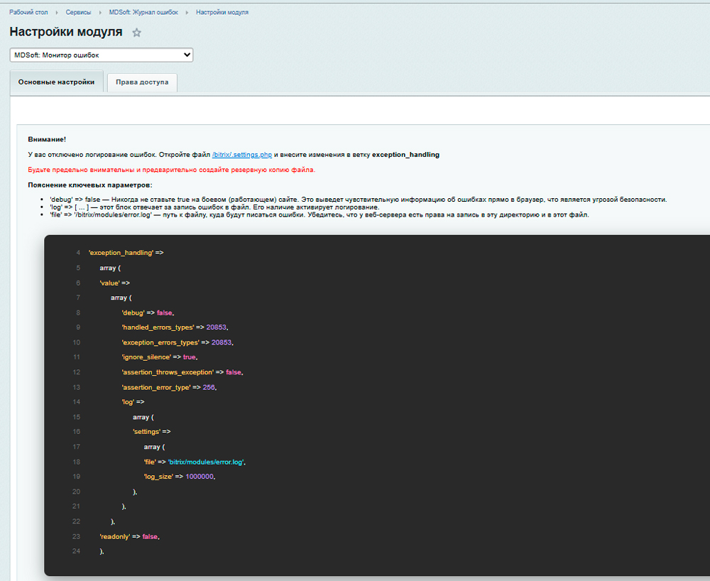 Наш модуль решает эту проблему, предоставляя мощный и наглядный инструмент для мониторинга, анализа и фильтрации ошибок прямо в админке Битрикс.