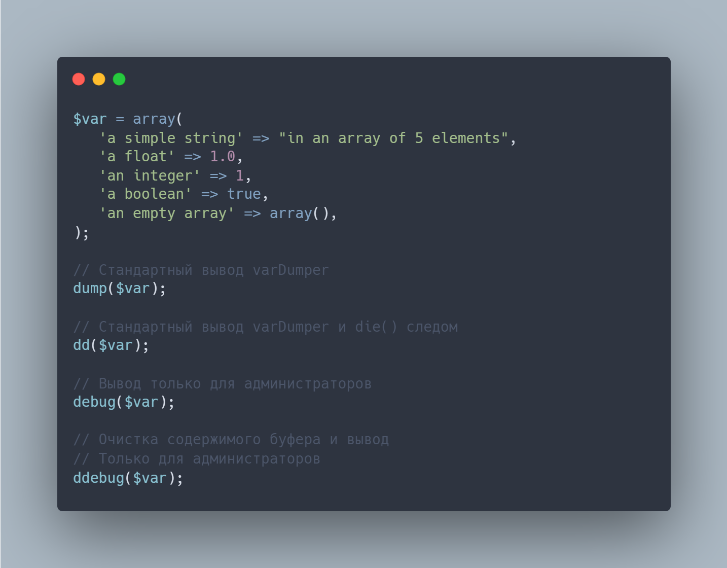 Модуль также предоставляет глобальную функцию dd() ("dump and die" - "сбрось и умри"). Эта функция отображает переменные используя dump() и сразу прекращает исполнение скрипта (используя функцию PHP exit). |