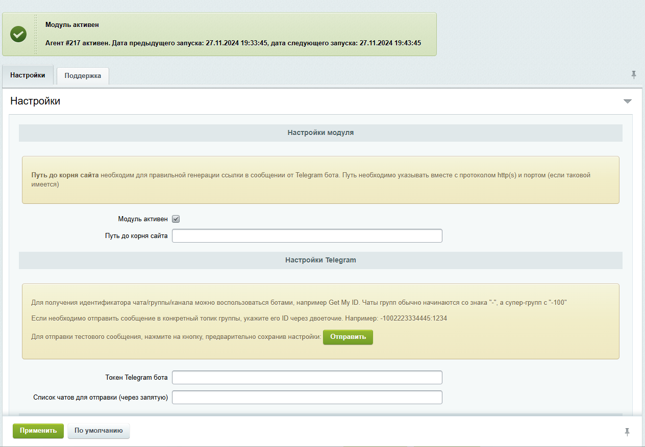 Модуль "Отправка сообщений из журнала событий в Telegram" позволяет настроить отправку уведомлений о новых записях в журнале событий.