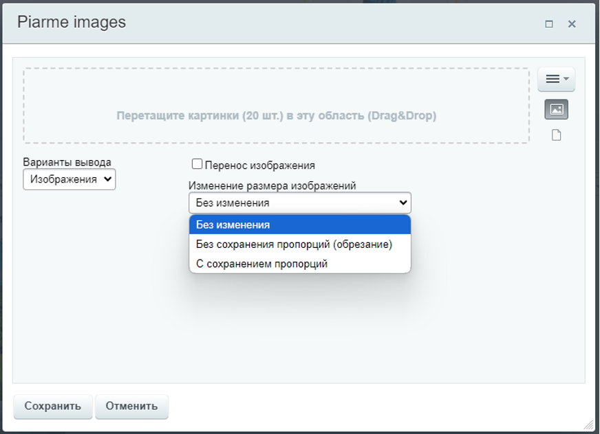 - Без сохранения пропорций, при котором изображения обрезаются для приведения к единому размеру.