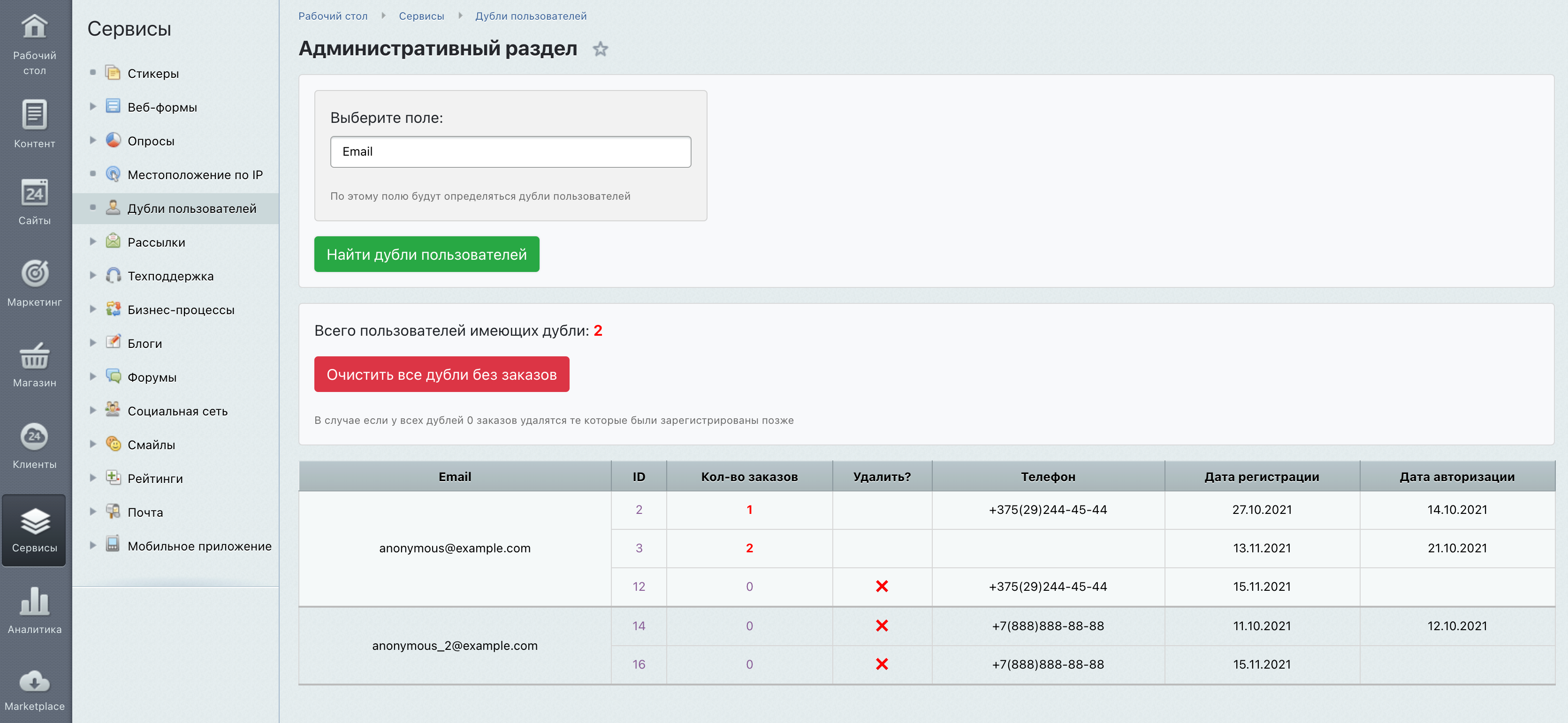 Данный модуль предназначен для поиска дублей пользователей и их удаления