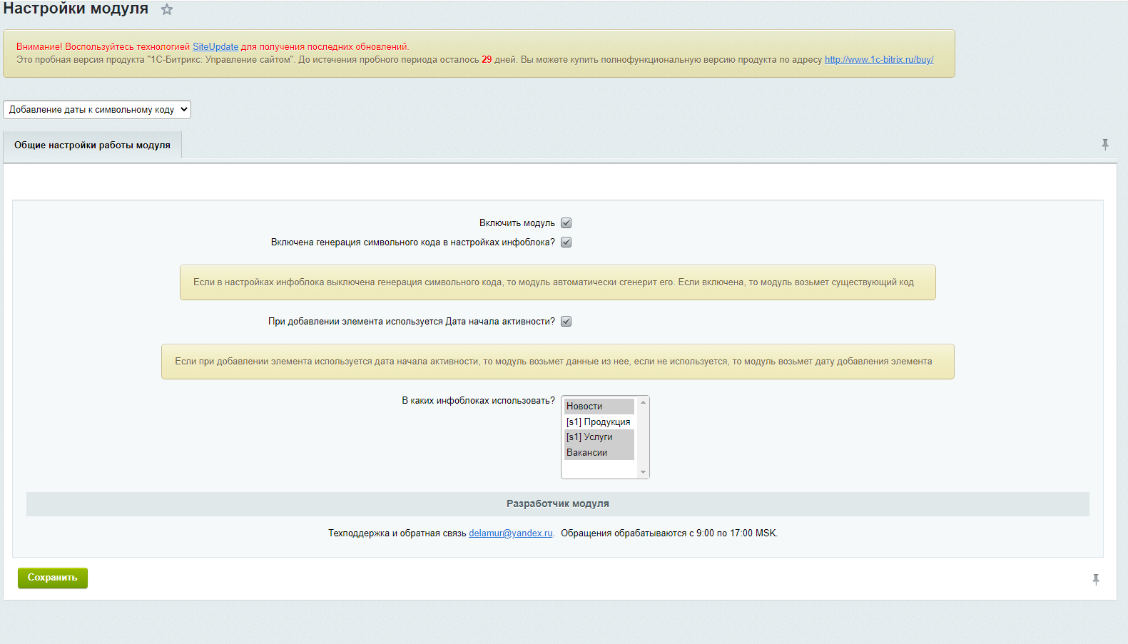 Модуль "Добавление даты к символьному коду" необходим контент-менеджеру в случае, когда при публикации элементов (новостей, товаров, услуг и т.п.) периодически встречаются одинаковые заголовки.