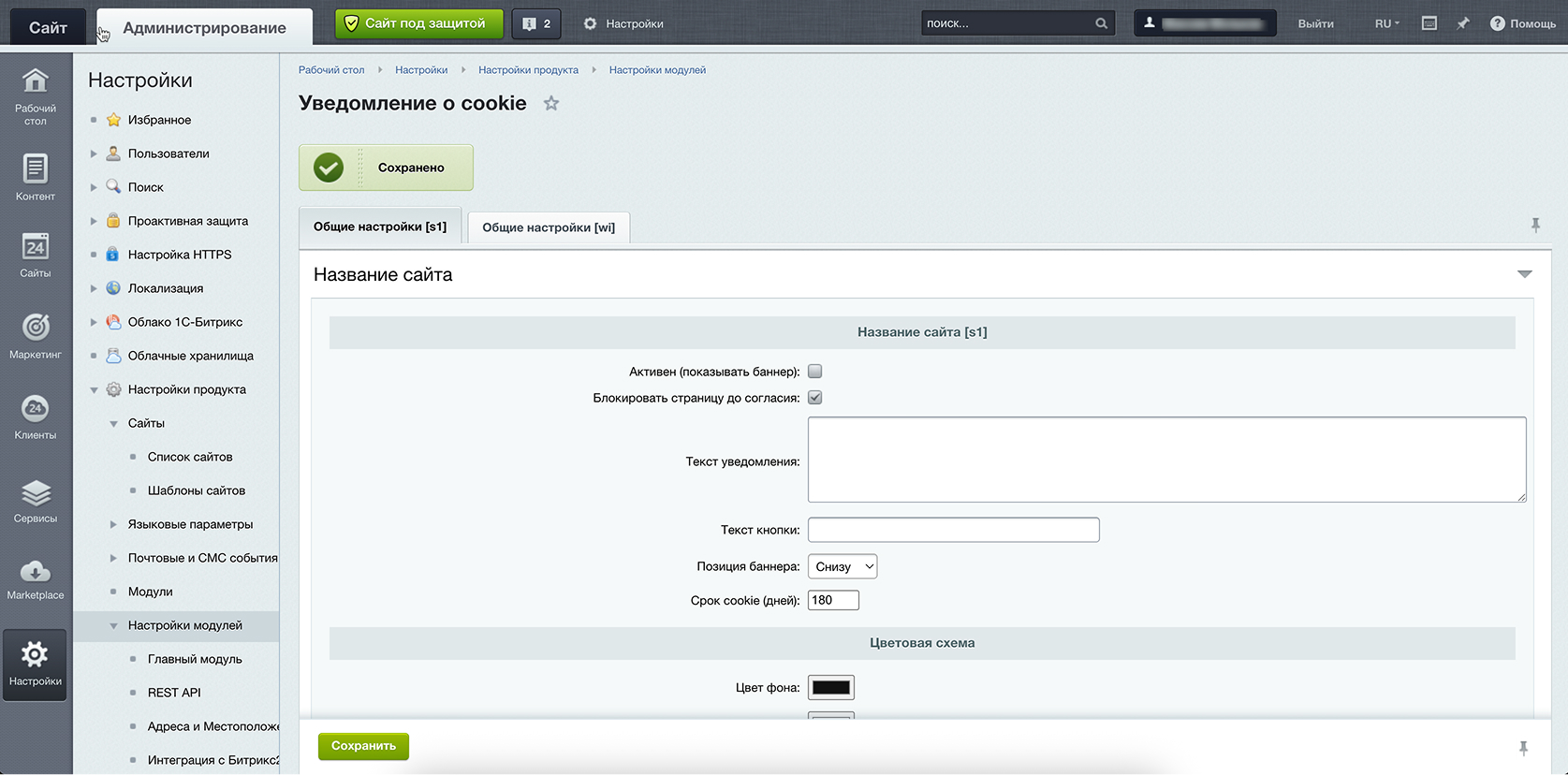 - Откройте «Настройки продукта → Модули → wbooster.cookies» и задайте параметры для нужного сайта.