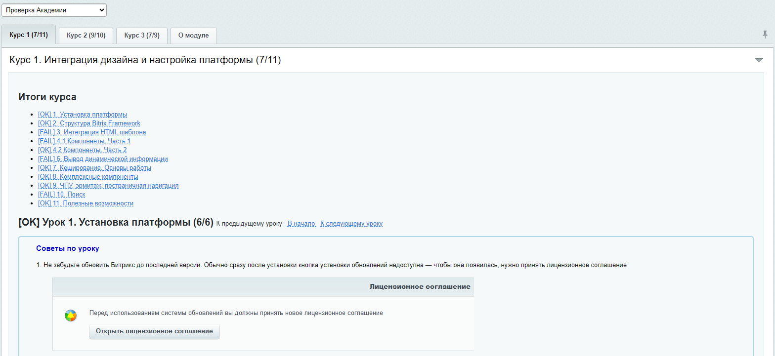 Набор автоматических проверок заданий Академии 1С-Битрикс: Управление сайтом для первых трех курсов Академии.