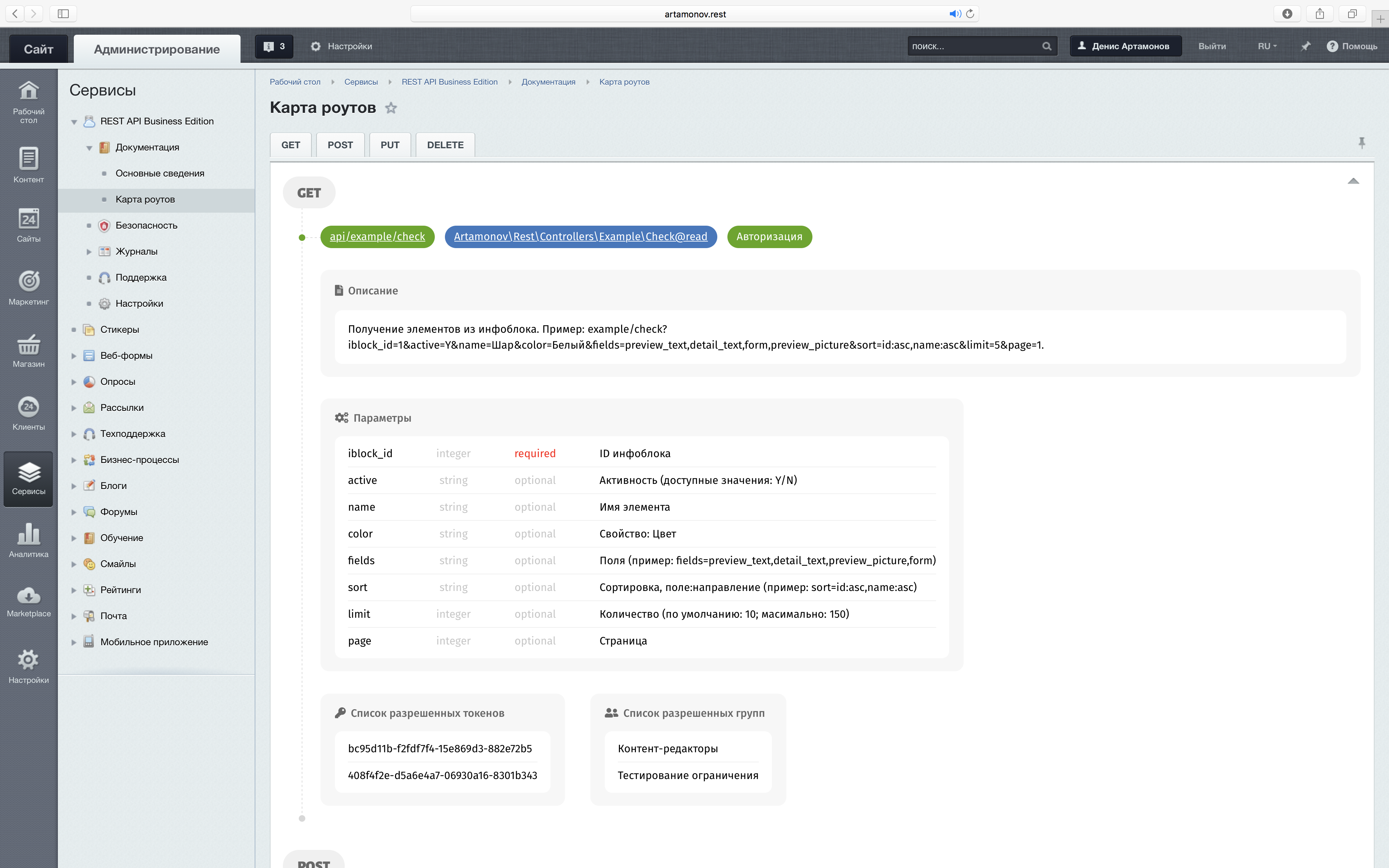 - Поддержка списка "белых" логинов/токенов для конкретного роута.