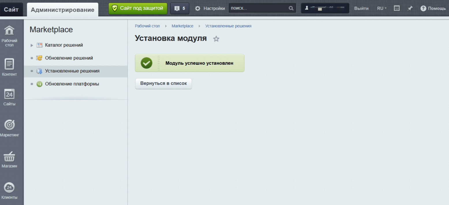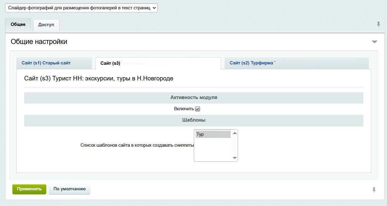1. После установки обязательно заходим в настройку модуля, ставим галочку активности модуля и выбираем шаблоны сайтов, для которых будет работать модуль. Можно выбрать несколько шаблонов, зажав Ctrl.