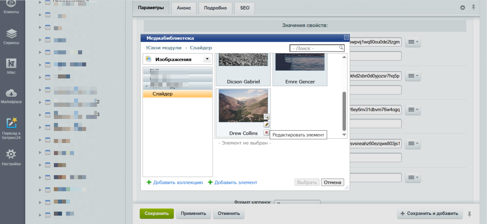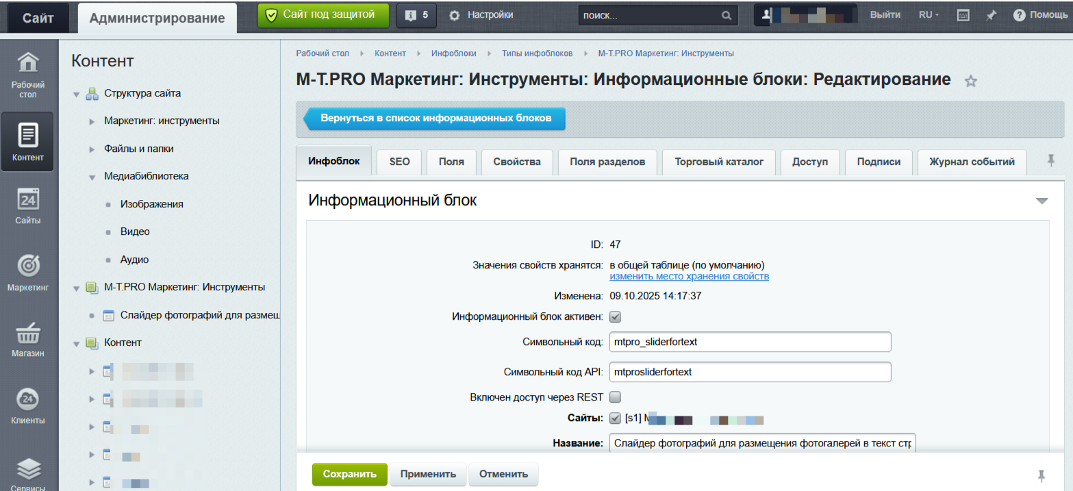 Удобство работы: Слайдер фотографий интегрирован с Инфоблоком, позволяя добавлять сразу несколько фотографий. Это существенно упрощает процесс, поскольку вам больше не нужно создавать множество отдельных элементов для одного слайдера. Всё организовано просто и удобно.