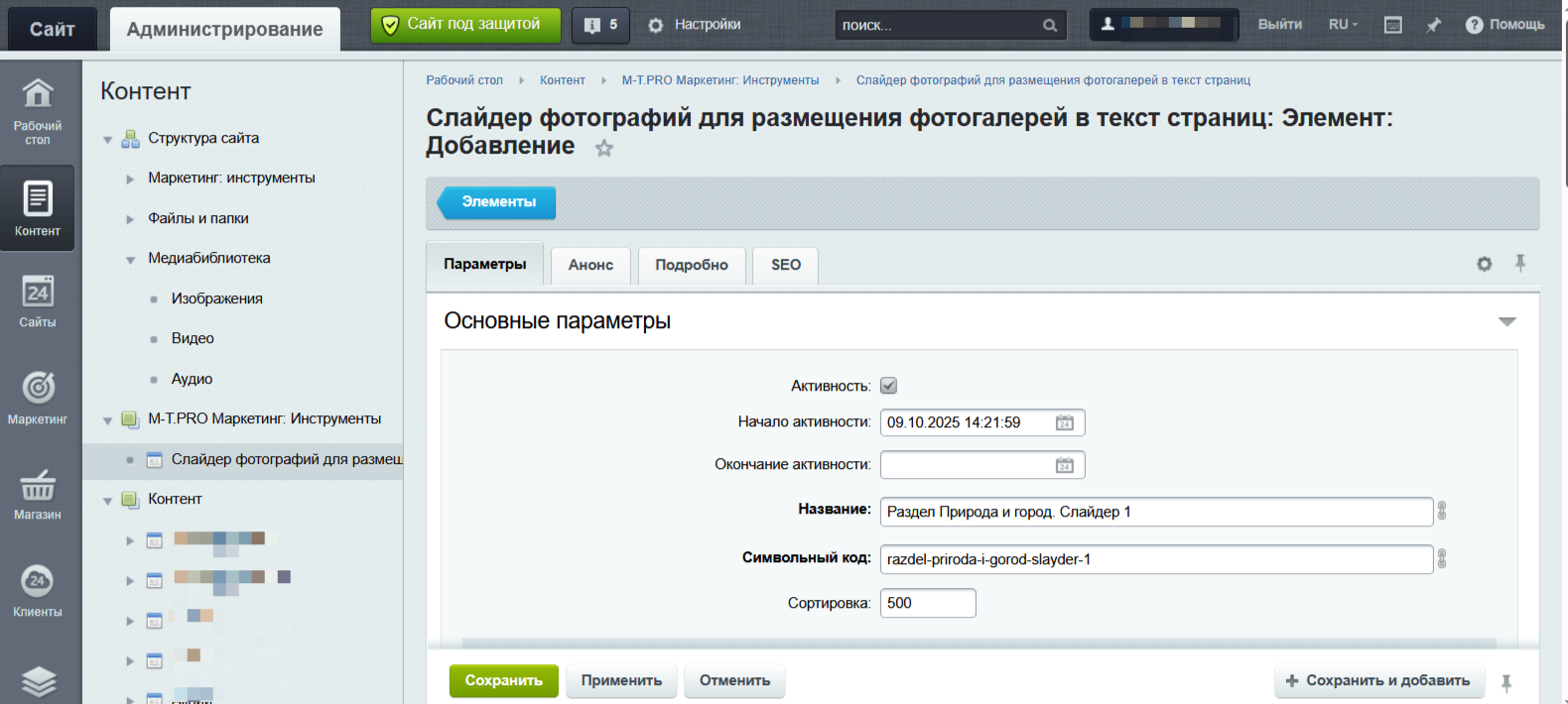 Гибкость размещения: Каждый элемент Инфоблока является самостоятельным слайдером, который можно использовать в различных частях сайта: в товарах, новостях, описаниях разделов или на статичных страницах. Это обеспечивает большую гибкость в адаптации контента.