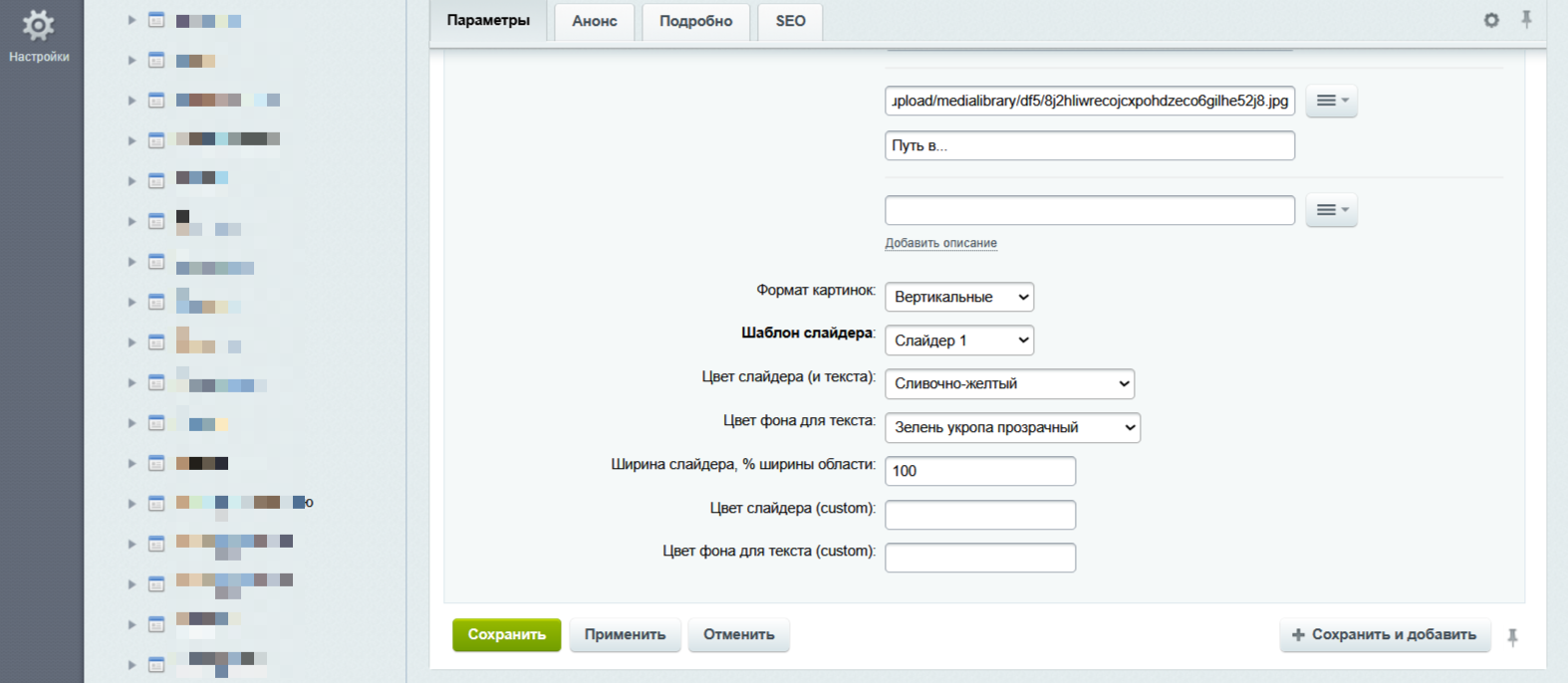 Настройки ширины: Ширина области слайдера задается в процентах, по умолчанию — 100%. Это значение можно изменить в настройках свойств Инфоблока, позволяя вам настроить слайдер под любые требования.