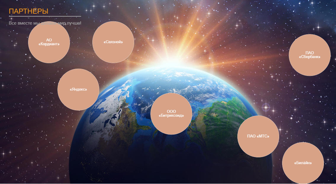 - Динамичный дизайн: Партнеры представлены в виде стильных плавающих шаров, которые придают вашему веб-сайту современный и динамичный облик. Этот дизайн создает впечатление легкости и инноваций.