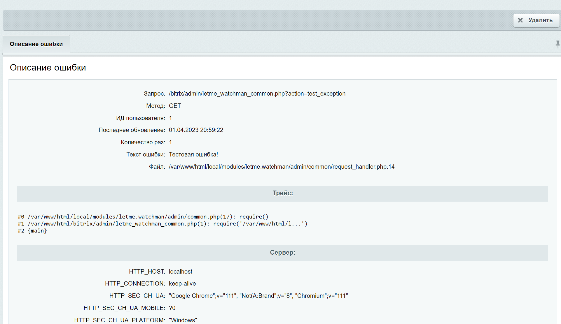 Наш модуль для CMS Bitrix является надежным инструментом для мониторинга за ошибками на вашем сайте. Вместе с ним вы можете быть уверены, что вы не упустите ни одной критической ошибки и получите мгновенные уведомления о них. Отчет о каждой ошибке содержит полный набор данных для анализа программных исключений, включая запросы, методы, текст ошибок, файлы, трейсы и многое другое.
