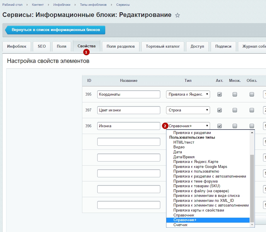 После установки решения в настройках инфоблока появится новый тип свойств элементов инфоблока "Справочник+".