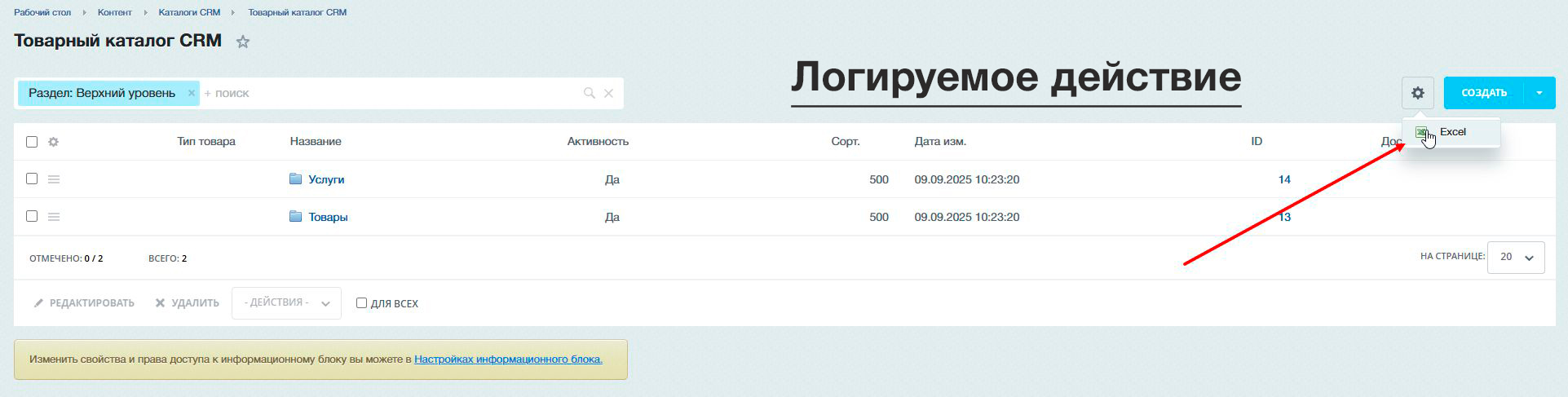 После активации модуль немедленно начнет фиксировать все операции выгрузки в Excel из административного раздела.