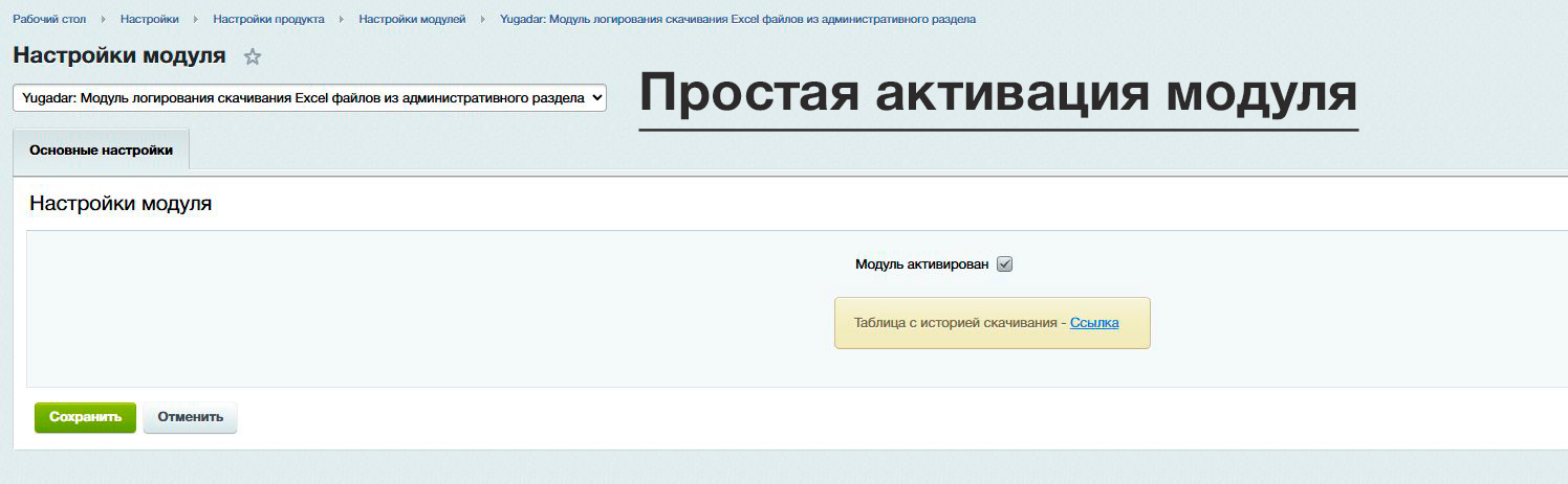 Найдите в списке модуль «Yugadar: Логирование экспорта в Excel из административного раздела».