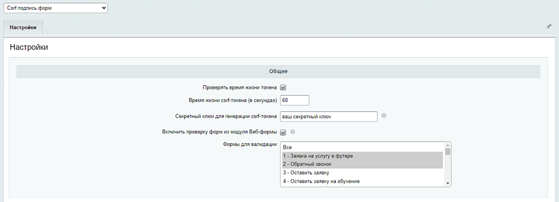 - Выберите необходимые для защиты формы модуля Веб-формы в настройках модуля