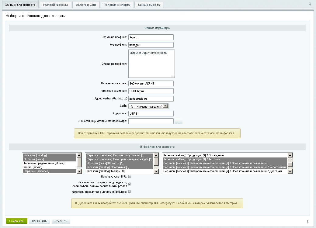 ВНИМАНИЕ! При изменении настроек «Инфоблок для экспорта», «Использовать SKU» - данные на вкладке «Условия экспорта», «Настройка схемы» сбрасываются! Основные инструкции по настройке модуля описаны на вкладке техподдержка http://screencast.com/t/6syWxRik2a обратите внимание что в видео, плейлист, а не одно видео - http://screencast.com/t/9xJ4A0ni