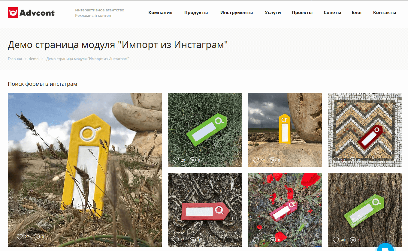 Модуль позволяет импортировать посты из аккаунта Инстаграм* на любую страницу сайта. Основные возможности модуля: