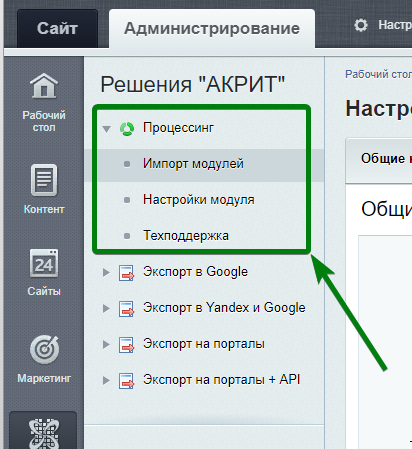 После установки в админке добавляется отдельная секция меню – Решения "АКРИТ", в ней есть меню «Процессинг», содержащее пункты:
