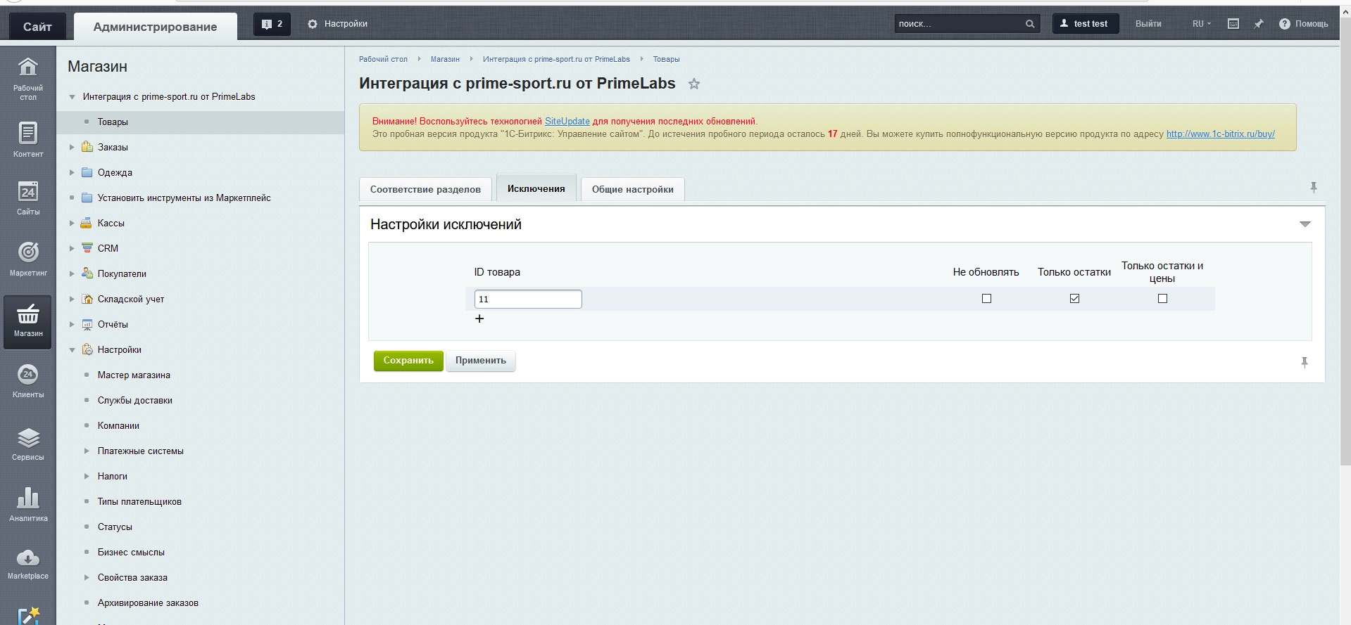 По умолчанию обновляются все данные по товару (у всех товаров установлено свойство “Обновлять”), включая названия и описания товаров. Если для товаров требуется не обновлять названия или остатки, или цены, то необходимо настроить для этих товаров исключения.