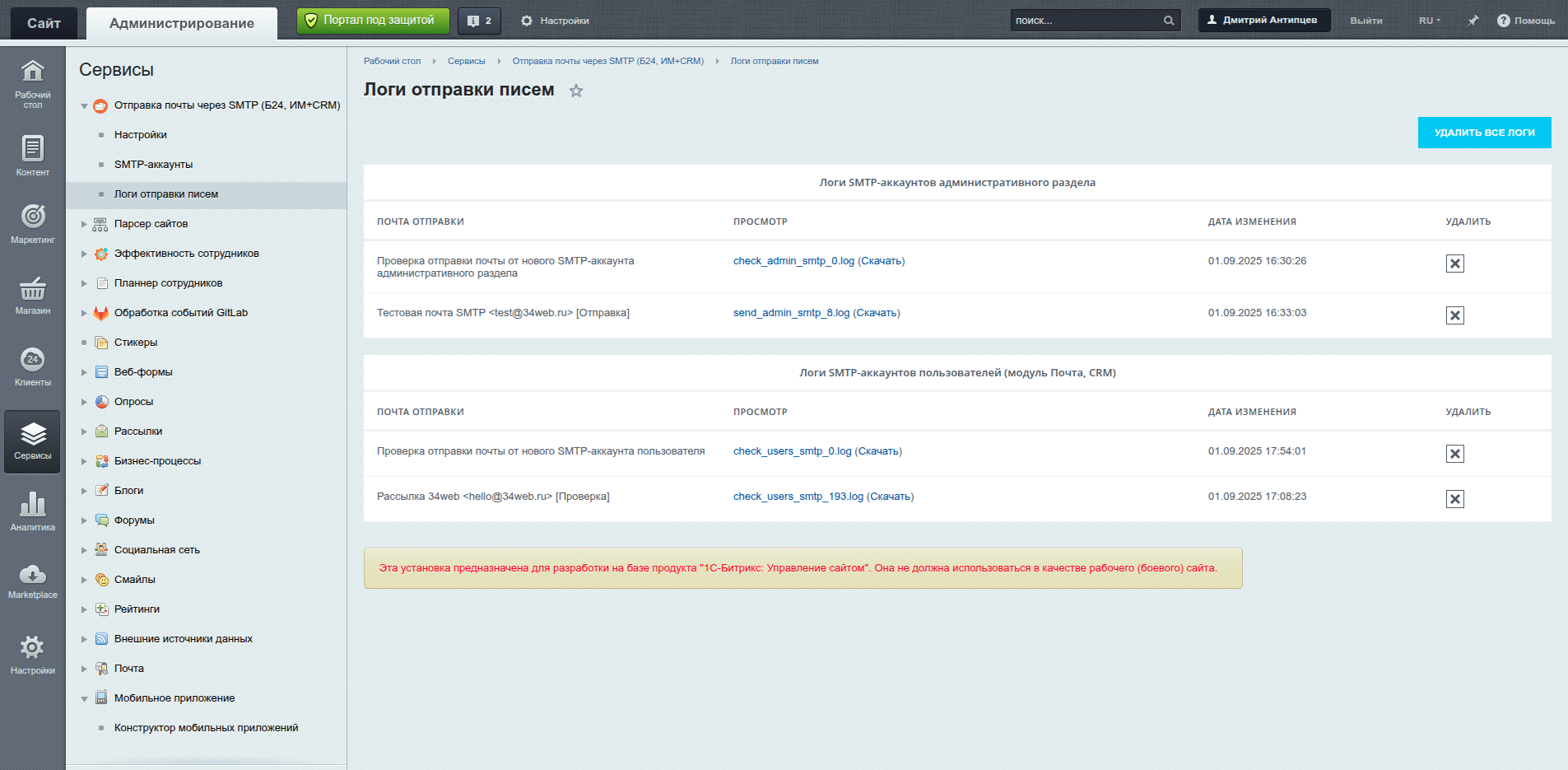Включение раздела управления SMTP-аккаунтами, просмотр логов и отправка почты начинает работать только после включения работы модуля на странице настройки параметров - "Настройки → Настройки продукта → Настройки модулей → Отправка почты через внешний SMTP (Коробка Битрикс24, Интернет магазин + CRM)".