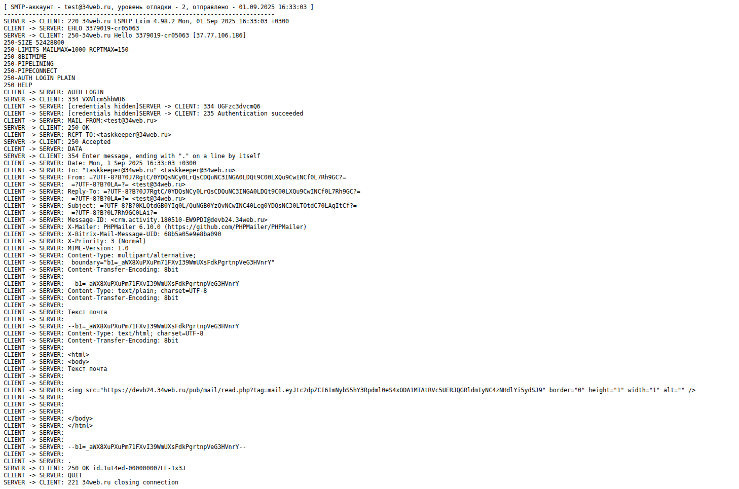 Для обеспечения приватности писем настоятельно рекомендуется отключить функционал логирования писем, если не требуется диагностика проблем отправки почты!