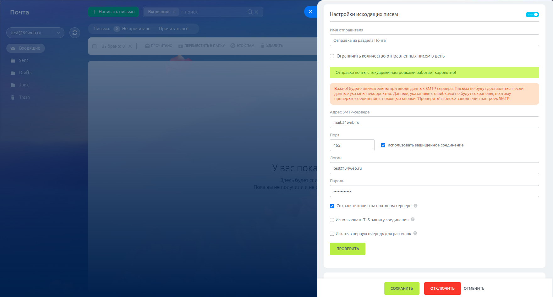 Пример настройки отправки почты для ящика в разделе "Почта":