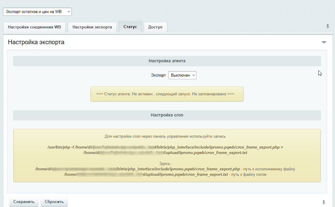 5. Укажите API ключ и номер склада, инфоблок с товарами. Сохраните. Выберите свойства с ID товара и штрихкодом. Настройте выгрузку цены и остатков.