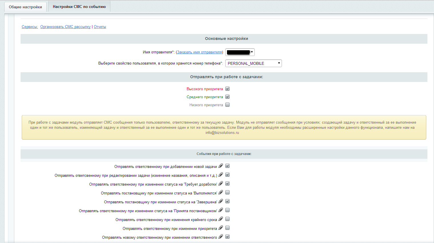 Возможность редактирования шаблонов для соответствующих событий. Поддержка многосайтовости: возможность настройки рассылки по событиям и соответствующие шаблоны индивидуально для каждого сайта. - Настройка разрешенного интервала (можно настроить запрет отправки SMS в ночное время).